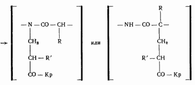 Для получения особенно прочной окраски кожи применяют крашение путем привитой полимеризации. Кислотные красители, содержащие олефиновые ненасыщенные боковые цепочки, широко используются при одновременном проведении крашения и привитой полимеризации. Окрашенные мономеры можно прививать к коллагену как в боковых, так ив основных цепочках. Прививка в основной цепочке может происходить по месту нахождения азота иминогруппы или по углерод - углеродной связи. Схематически такое взаимодействие может быть представлено так (где R - боковая цепочка; R'-Н, СН3 или Вг; Кр - остаток красителя):