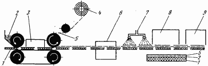 6 - камера для тиснения; 7 - нанесение отделочного покрытия; 8 - подсушка;