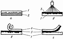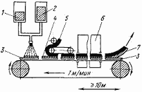 Технически переносной метод осуществляется следующим образом. Из двух резервуаров 1 и 2 (рис. 76) на матрицы 3 одновременно дозирующими насосами через смесительную головку наносится предполимер и отвердитель 4 в количестве 150-200 г/м2. Возможны два варианта: диамид +предполимер, содержащий концевые группы - NCO или диизоцианат +предполимер, оканчивающийся гидроксильными группами [83]. В раствор отвердителя можно добавлять специальный пигмент. Следует отметить, что используемые в качестве отвердителя диамины могут быть медленно реагирующими (диамин - 4,4'-дихлор-З,З'-дифениламин) или же быстро реагирующими (диамин-дифенилметан).