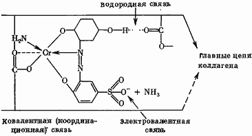 Нарушение показанных на схеме связей происходит под воздействием различных соединений. Например, электровалентные и водородные связи разрушаются под действием воды. Если допустить, что краситель образует с волокнами кожи только электровалентные связи, которые под влиянием воды нарушаются, то он перейдет в раствор. Подобное явление может произойти с образовавшимися в ограниченном количестве водородными связями. Но если молекула красителя образует значительное число водородных связей, для их нарушения требуется применение моющих веществ. Образовавшиеся же ковалентные (при крашении активными красителями) или координационные (при крашении металлсодержащими красителями) связи будут устойчивы к упомянутым обработкам и могут быть нарушены только обработкой органическими растворителями, вытесняющими функциональные группы белка из металла, содержащегося в красителе.