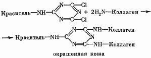 Опыты по определению устойчивости окраски кожи к действию моющих веществ и химической чистки показали, что чем больше образуется координационных связей, тем устойчивее окраска к действию химической чистки. Такие же результаты получаются при крашении кожевенного полуфабриката активными красителями, сопровождающемся образованием ковалентной связи, дающей весьма прочную окраску. Из активных красителей наиболее устойчивую окраску кожи дают дихлорпроизводные хлорангидрида циануровой кислоты: