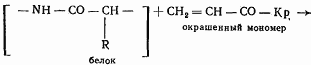 Для получения особенно прочной окраски кожи применяют крашение путем привитой полимеризации. Кислотные красители, содержащие олефиновые ненасыщенные боковые цепочки, широко используются при одновременном проведении крашения и привитой полимеризации. Окрашенные мономеры можно прививать к коллагену как в боковых, так ив основных цепочках. Прививка в основной цепочке может происходить по месту нахождения азота иминогруппы или по углерод - углеродной связи. Схематически такое взаимодействие может быть представлено так (где R - боковая цепочка; R'-Н, СН3 или Вг; Кр - остаток красителя):
