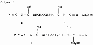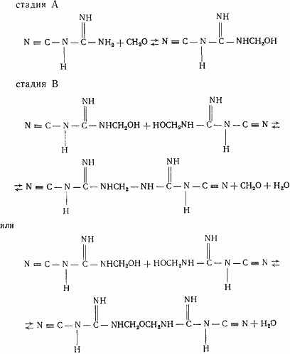 Рассмотрение резонансной структуры ДДА (I) показывает, что вследствие индуктивного (<) и мезомерного (>) эффектов происходит изменение электронной плотности у атомов азота, в результате чего вся молекула ДДА оказывается частично положительно заряженной. При реакциях с формальдегидом такое положение сохраняется, и ДДА-смолы обычно получаются катионными. Реакция поликонденсации ДДА с формальдегидом очень сложная и идет в три стадии (А, В и С): образование растворимых метилольных соединений; получение водонерастворимого полимера вследствие реагирования метилольных групп соседних молекул и возникновения метиленовых мостиков между ними; переход этого продукта снова в водорастворимое состояние: