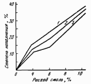 Рис. 20. Влияние расхода ДДА -смолы Retingan R-6 на степень наполнения пашин (1), чепрака (2) и пол (3)