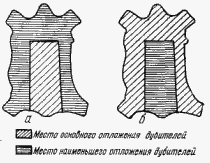 В отличие от растительных и синтетических дубителей аминосмолы в основном поглощаются рыхлыми периферийными участками (рис. 21).