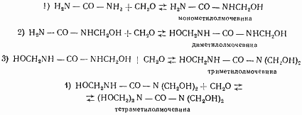 Независимо от условий протекания реакции мочевины с формальдегидом в первой ее стадии образуются оксиметиленовые (метилольные) группы. Мочевина имеет четыре реакционноспособных атома водорода и теоретически может присоединить четыре молекулы формальдегида, образуя тетраметилольные соединения [46]: