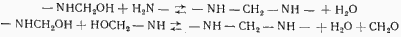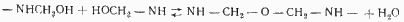Реакции взаимодействия с формальдегидом таких соединений, как мочевина, меламин и ДДА, в молекуле которых имеются группы амидного типа, характеризуются определенными закономерностями. Эти реакции протекают в несколько стадий, и направление их зависит от температуры, рН, концентрации реагентов и т. д. Первой стадией реакции является присоединение формальдегида к амидной группе с образованием метилольных производных. Метилольные производные в соответствующих условиях взаимодействуют между собой, образуя линейные полимеры высокой степени поликонденсации. При повышении температуры, понижении рН или одновременном их изменении может происходить дальнейшая поликонденсация, приводящая к возникновению пространственных структур, т. е. к сшиванию, желатинизации и отверждению.