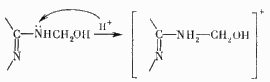 В процессе подкисления метилольные производные меламина и их конечный продукт - смола приобретают положительный заряд, что объясняется образованием комплексных соединений катионного типа (четвертичных аммониевых соединений) по схеме