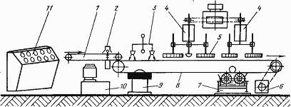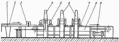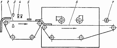 1 и 6 - струнные конвейеры; 2 - кожа; 3 - опорный валик;