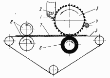 Печатающая машина может применяться для всех видов кожи, достаточно толстой и не имеющей дефектов (эти места не пропечатываются). Ракельный нож 1(рис. 83) машины располагается под углом 35-55° к поверхности печатающего вала 3, который наносит краску 2 на кожу 7 и выгравировывает на ней рельефный рисунок. Валик 6 играет роль опоры. Кожа расправляется валиками 8 и перемещается конвейером 5. Валик 4 служит для очистки печатающего вала. Зазор между ножом и валом 3 регулируется специальным приспособлением. Если на выпуклости рельефного рисунка тампоном нанести подцветку, то можно получить двухцветную кожу. Количество наносимой на кожу краски зависит от ее вязкости и величины зазора.