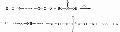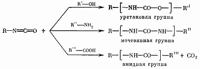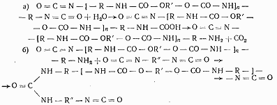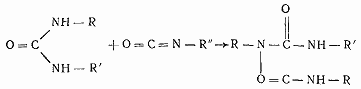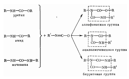 Образовавшиеся первичные продукты присоединения, содержащие реакционноспособные мочевинные, амидные и другие группы, могут вступать во вторичную реакцию с изоцианатными группами, образуя разветвленную или сшитую структуру: