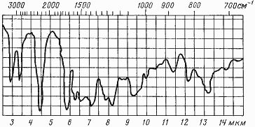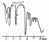 На рис. 63 показан ИК -спектр диизоцианата с характерными полосами поглощения при длине волны 3, 3,4 и 4,4 мкм (полосы изоцианата); 5,8-5,9 (колебания карбонильной группы эфирной структуры); 6,2-6,3, 6,5-6,6 (амидная связь).
