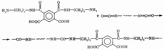Одним из примеров получения анионного иономера может служить реакция предполимера с продуктом взаимодействия этилендиамина с ангидридом пиромелитовой кислоты [86]: