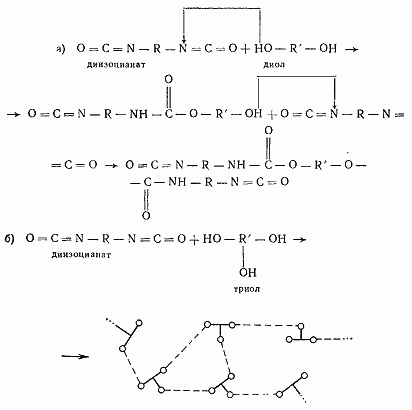 (В схеме использованы обозначения: - - - - - - - диизоцианат, 0 -уретановая группа, I -триол).При взаимодействии триизоцианата с диолом также получаются продукты с пространственной структурой.