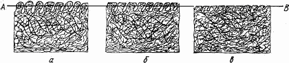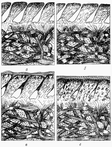 Рис. 73. Схематическое изображение кожи до шлифования (а),