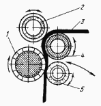 Разводка осуществляется с помощью ножевого вала 1 (рис. 86) со спиральными ножами, которые имеют хорошо отшлифованные и закругленные кромки и изготовляются из латуни или нержавеющей стали. К ножевому валу 3 кожа прижимается лицевой поверхностью с помощью двух прижимных валов 4 и 5, обтянутых мягким войлоком. Оба прижимных вала вращаются в одном направлении и имеют более низкую окружную скорость по сравнению со скоростью ножевого вала. К верхнему прижимному валу прижимается гладильный вал 2, который изготовлен из латуни, поверхность его хромирована или же отполирована. Иногда этот вал нагревается с помощью электрического тока или пара для достижения лучшего эффекта разводки. В разводных машинах некоторых типов прижимной и ножевой валы могут менять направления вращения, с помощью чего достигается реверсирование хода машины. Кожа в этом случае может быть повторно подвергнута разводке при одноразовом введении ее в машину. Так работает большинство разводных машин.
