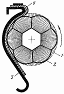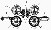 Машина имеет два разводных узла, каждый из которых состоит из ножевого 1 (рис.89) и прижимного 3 валов. Последние могут опускаться и подниматься с помощью гидравлического привода. Разводные валы имеют винтовые ножи из нержавеющей стали или латуни, расположенные по винтовым линиям с двумя различными углами подъема. Между разводными валами находятся верхние 6 и нижние 4 направляющие валики, причем верхние валики через пружину связаны с датчиками.