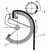 1 - капроновые щетки; 2 - спиральные ножи; 3 - эластичная подложка; 4 - обрабатываемая кожа