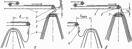 1 - струнный конвейер; 2 - подвижной вал конвейера; 3 - тележка укладчика;