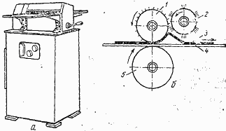 Рис. 26. Внешний вид (а) и схема (б) тиснильной машины 201/Р4: