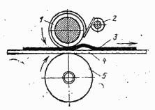 1-тиснильный вал; 2 - снимающая щетка; 3 - кожа; 4 - подложка; 5 - прижимной вал
