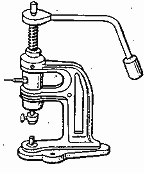 Для прикрепления заклепок, колец, обтяжки пуговиц и перфорации перчаток до сих пор применяют ручные прессы (рис. 28). Ручной пресс имеет чугунную С-образную станину, в основании которой расположена нижняя формующая часть пресса, в то время как в верхней части расположен винт с нарезкой, заканчивающийся изогнутым рычагом. К прессу прилагаются различные приспособления и инструменты. Ручные прессы имеют небольшую массу, поэтому их легко можно перенести и разместить на рабочем столе.