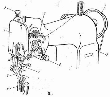 4 - ручное колесо; 5 - опора; 6 - винт установки длины стежка; 7 - ниточный тормоз;