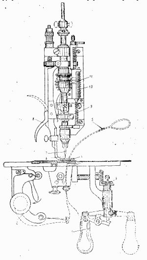 Ручным рычагом можно просто и быстро менять направление строчки и этим определять форму и размеры вышивки. Можно вышивать и сложные узоры, предварительно нарисованные на лицевой стороне перчатки. Рычаг служит также для пуска машины путем включения и выключения муфты привода.