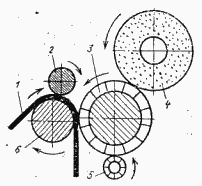 1 - кожа; 2 - прижимной вал; 3 - ножевой вал; 4 - абразивный круг; 5 - отводящий вал;
