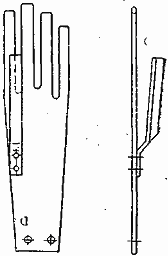 Шаблон 462/Р1 (рис. 17) служит для контроля ширины перчатки. Он представляет собой латунный измеритель с тремя или пятью планками, которые можно перемещать пантографом от средней оси или краев. Шаблон имеет шкалы в дюймах и миллиметрах. Шаблон прижимают к штемпельной подушке и клеймят на изнаночной стороне перчатки контрольные линии.