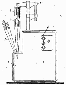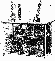 Регулятор связан с тепловым реле нагревателя. Около регулятора на панели расположены сигнальные лампочки. Остальные электроприборы расположены в задней части панели. В станине имеются два ящика и шкаф для размещения съемных правил и материалов. Максимальная мощность машины 660 Вт.