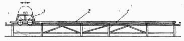 1 - каретка с рулоном; 2 - рельсы для каретки; 3 - стальная основа стола.