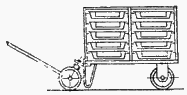 Тележка 404/Р2 служит для перевозки полуфабрикатов и перчаток. Сварной трубчатый каркас смонтирован на площадке "Синус-600" размерами 1200х800 мм и имеет высоту 1015 мм. В каркасе размещены 20 полок размерами 550x390X90 мм. Полки установлены на уголках и их легко можно вставлять и вынимать. Каркас установлен на четырех обрезиненных колесах (рис. 47).