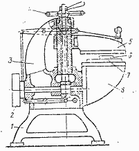 1 - подставка; 2 - маховик с муфтой; 3 - чугунная станина;